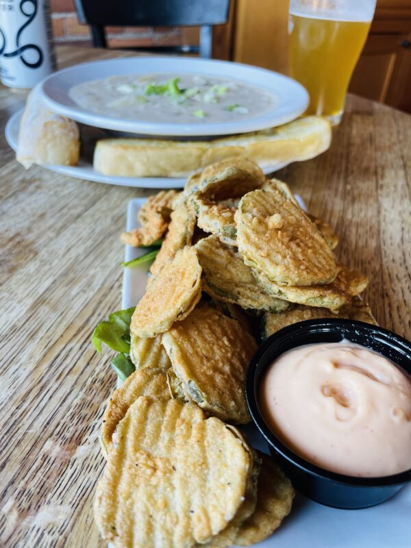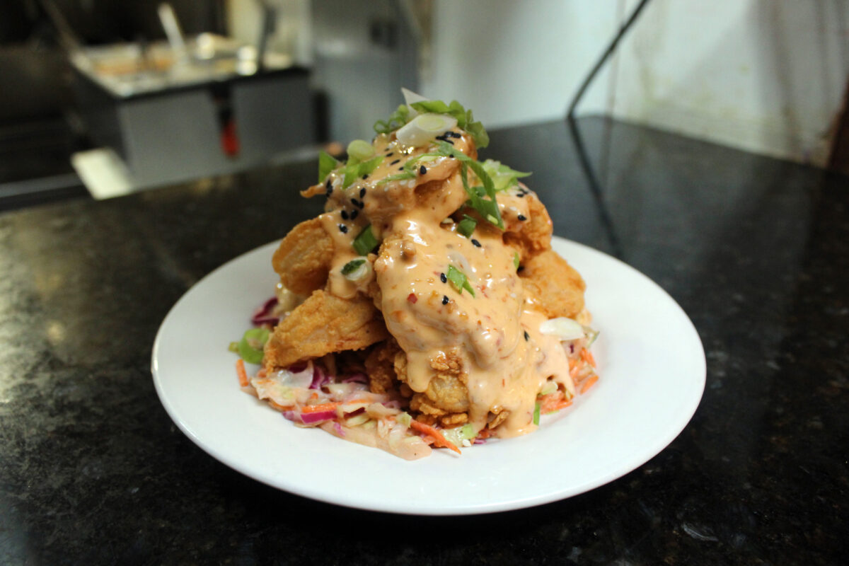 Lightly battered and fried chicken thigh, sriracha aioli, pickles, and apple slaw on a house bun