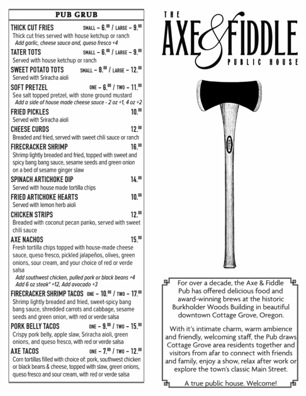 For over a decade, The Axe & Fiddle has offered delicious food and award-winning brews at the historic Burkholder Woods Building in beautiful downtown Cottage Grove, Oregon.