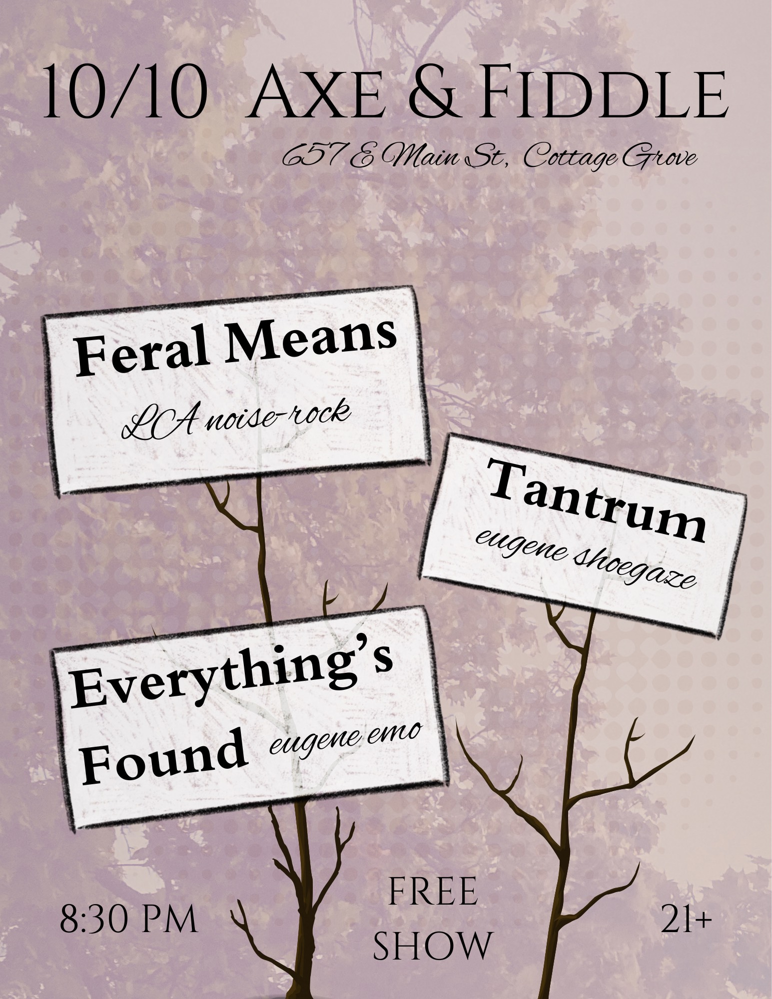 FREE SHOW Hardcore / Noise / Emo / Shoegaze A night of raw energy and genre-bending soundscapes featuring: 🎸 Feral Means (LA) – Post-hardcore noise with a fierce edge and ambient depth. 🎤 Tantrum (Eugene) – Gritty, shoegaze-influenced punk from a rising local 6-piece. 💔 Everything’s Found (Eugene) – Melodic emo/alt blending 90s nostalgia with [...]